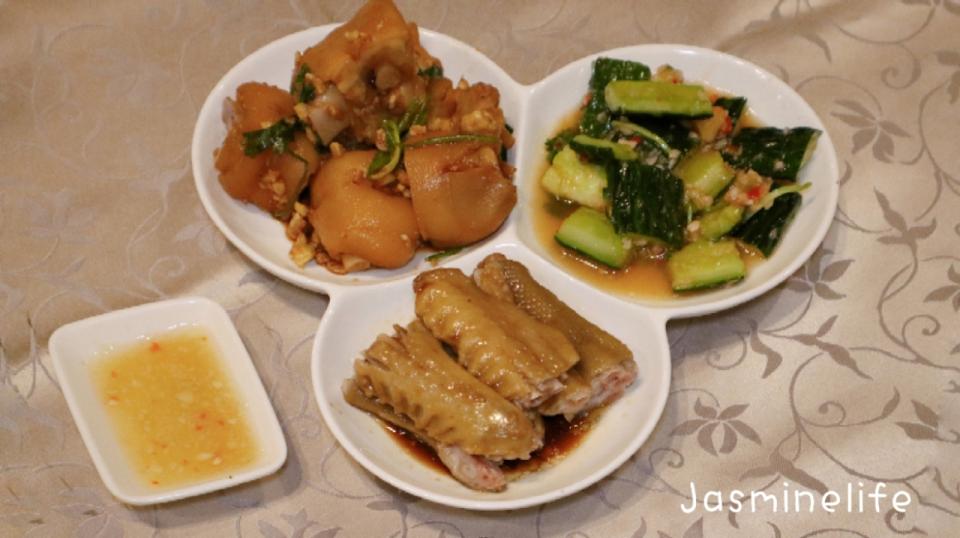 三弄包括:鹵水掌翼、手拍青瓜、香茜鮮沙薑豬手粒